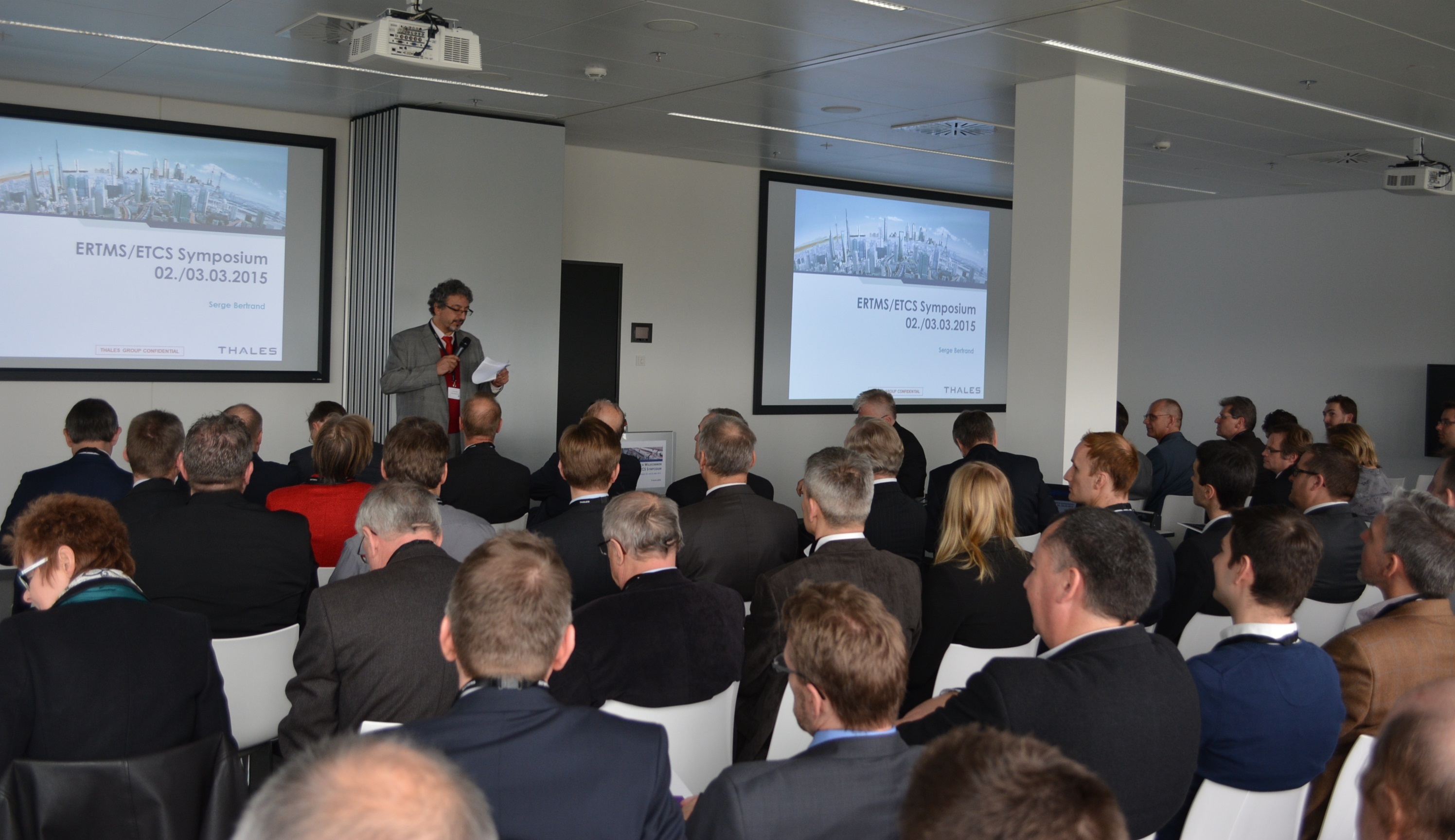 Serge Bertrand, Geschäftsbereichsleiter Ground Transportation Systems, begrüßte die Teilnehmerinnen und Teilnehmer und betonte in einer kurzen technischen und kommerziellen Bestandsaufnahme die führende Marktposition von Thales Deutschland im Bereich ERTMS (European Rail Traffic Management System) seit 15 Jahren. Gleichzeitig zeigte er sich zuversichtlich, dass sein Geschäftsbereich auf diesem Segment weiter erfolgreich tätig sein wird.