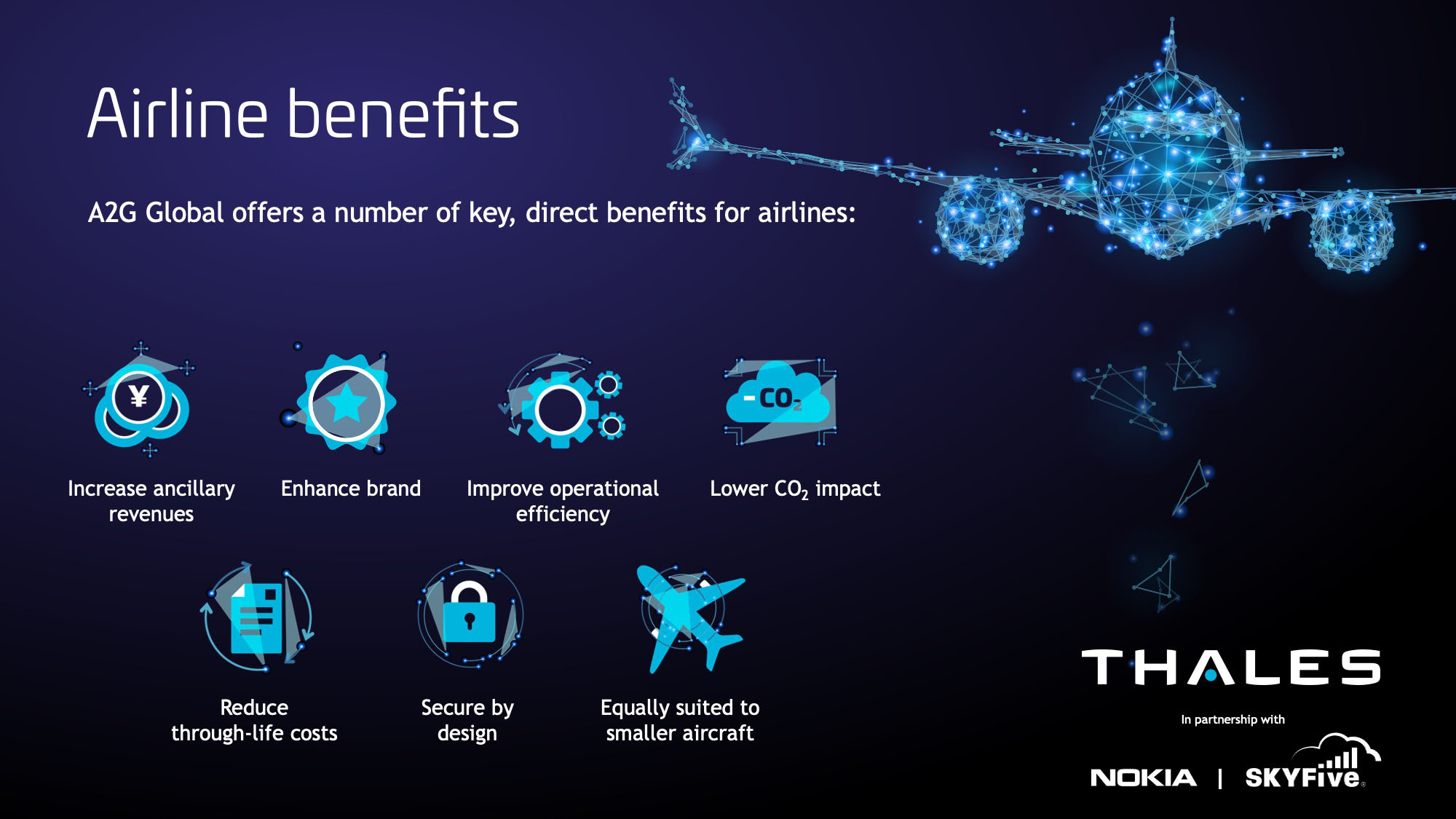 Following successful rollout across Europe, Thales in the UK, Nokia and SkyFive are launching a new 4G LTE Air to Ground (A2G) solution to a global market. Delivering a fibre like connectivity experience, A2G significantly improves the inflight access to web, streaming and on-line games to passengers. In addition to improved passenger experiences, aircraft operators will benefit from significantly shortened installation times, minimising the time aircraft are out of operation.
