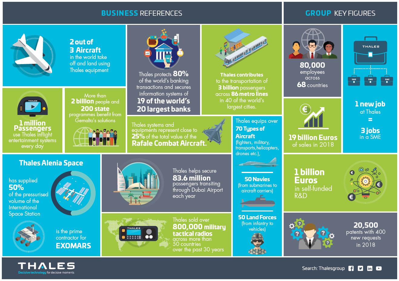 About Thales The people who make the world go round – they rely on Thales. Our customers come to us with big ambitions: to make life better, to keep us safer. Combining a unique diversity of expertise, talents and cultures, our architects design and deliver extraordinary high technology solutions. Solutions that make tomorrow possible, today. From the bottom of the oceans to the depths of space and cyberspace, we help our customers think smarter and act faster – mastering ever greater complexity at every decisive moment along the way. Thales generated revenues of €19 billion in 2018 with 80,000 employees in 68 countries. |