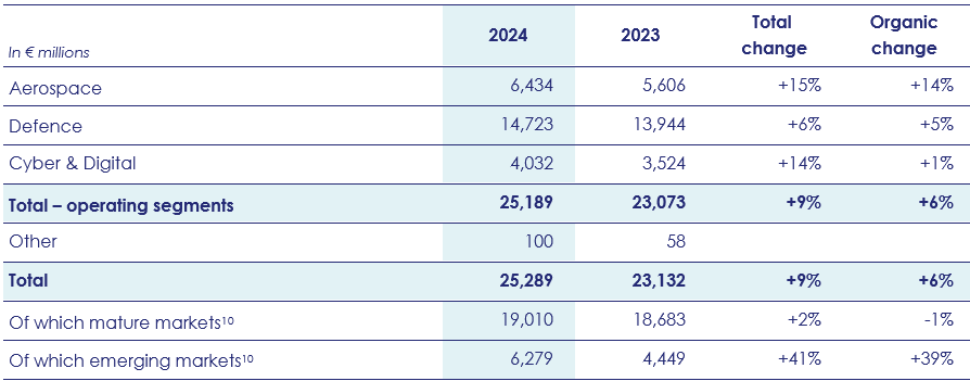 Order intake for the 2024 financial year increased by 9% compared with 2023 at €25,289 million and by +6% on an organic basis (i.e. at constant scope and exchange rates). Commercial performance was once again supported by strong demand in the Defence segment and by continued sustained momentum in the Aerospace segment. As at 31 December 2024, the consolidated order book amounted to nearly €51 billion, a record level, up by nearly €5.4 billion compared with the end of 2023.