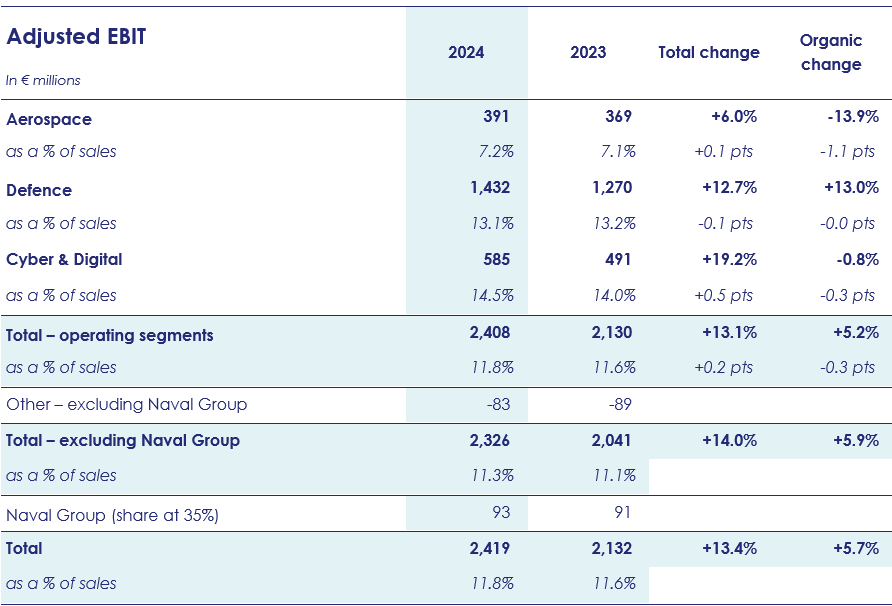 Adjusted EBIT for the Defence segment amounted to €1,432 million, compared with €1,270 million in 2023 (an increase of +13.0% at constant scope and exchange rates). The margin for this segment was stable at 13.1%, compared to 13.2% in 2023.