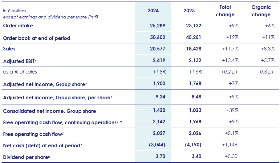 Sales totaled €20,577 million, up 11.7% from 2023 (+8.3% in organic growth). This robust growth reflects in particular the solid performance of the Defence business throughout the year.
