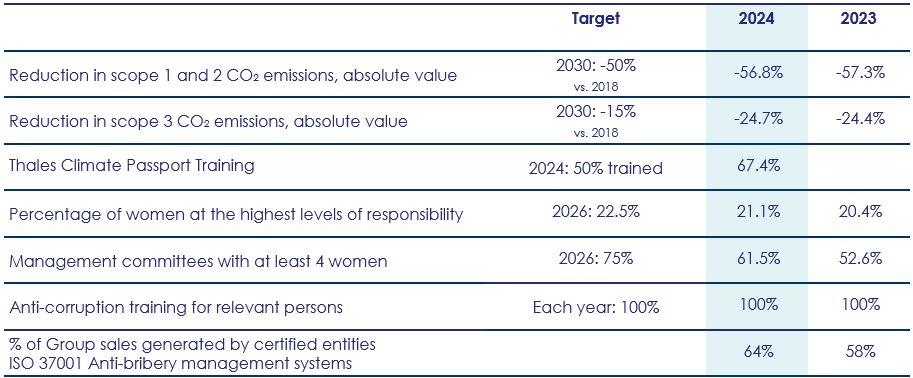 In terms of the fight against global warming, scope 1 & 2 CO2 emissions fell by 56.8% in 2024 compared to 2018 and scope 3 emissions fell by 24.7% compared to 2018. The Group has thus achieved its 2030 targets ahead of schedule for the second consecutive year. The absolute value reduction targets for carbon footprint remain relevant for 2030 given the Group's growth prospects. To raise employee awareness to climate change and its impacts on society and on the Group, a voluntary training named "Thales Climate Passport" was deployed in 2024 with the aim of training 50% of managers. Over 67.4% of managers, representing around 35,000 employees, completed this training course in 2024, demonstrating the great success of this training.