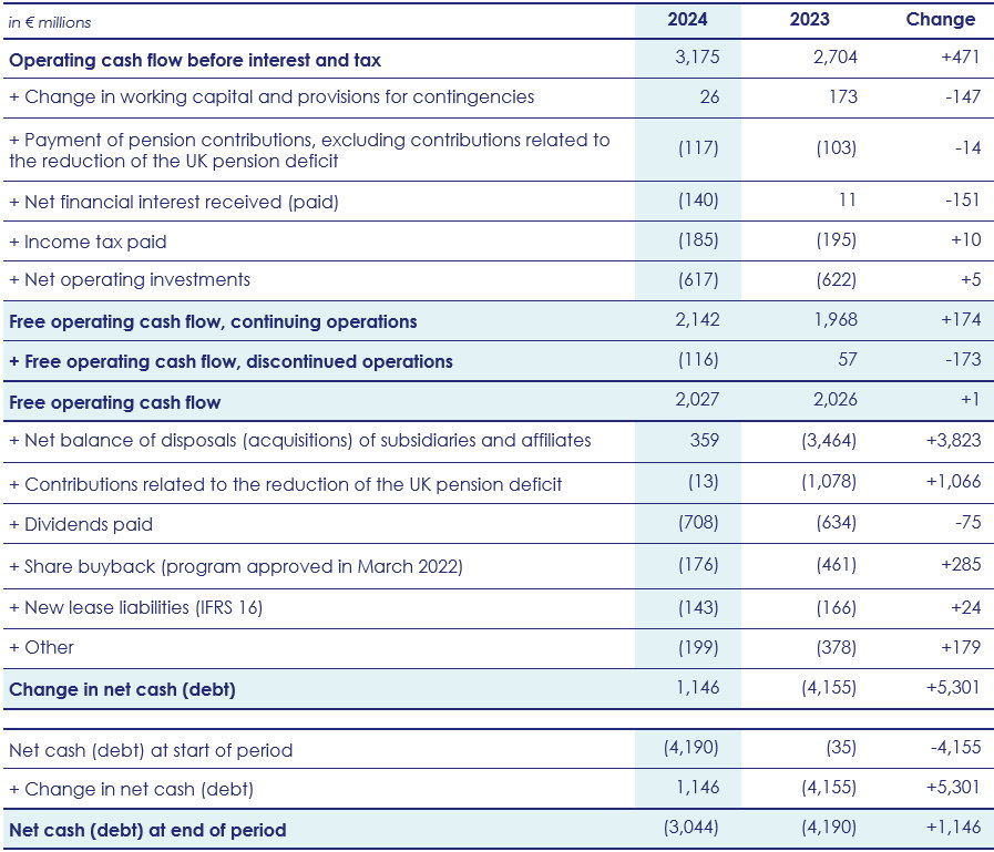 Free operating cash flow from continuing operations7,9 amounted to €2,142 million, compared with €1,968 million in 2023. Including the contribution of discontinued operations, free operating cash flow7 amounted to €2,027 million, compared with €2,026 million in 2023.