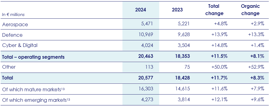 Sales for the 2024 financial year totaled €20,577 million, compared to €18,428 million in 2023, up 11.7% in total change and 8.3% in organic terms (at constant scope and exchange rates14), driven in particular by the robust performance of the Defence segment.