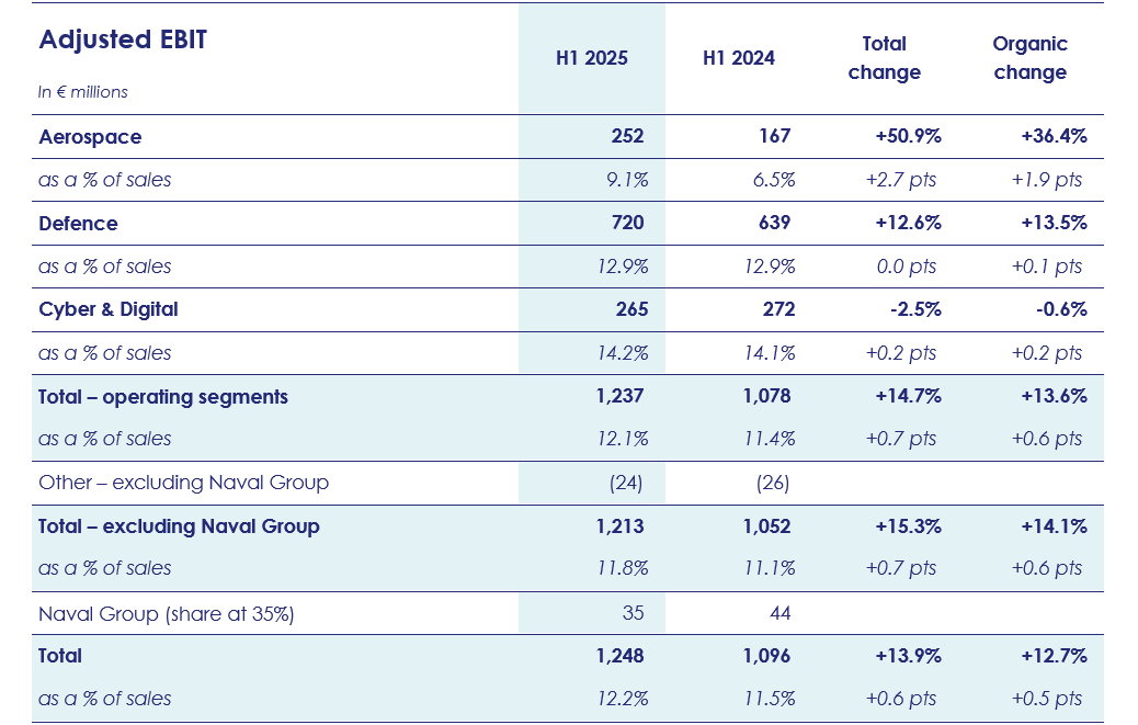 The Aerospace segment recorded an Adjusted EBIT of €252 million (9.1% of sales), compared with €167 million (6.5% of sales) in the first half of 2024. The Adjusted EBIT margin recorded a strong increase, driven by the solid performance of the Avionics activities that posted a robust double-digit margin. It also benefited from the significant Adjusted EBIT improvement in Space, which is expected to be positive in 2025 before restructuring costs.