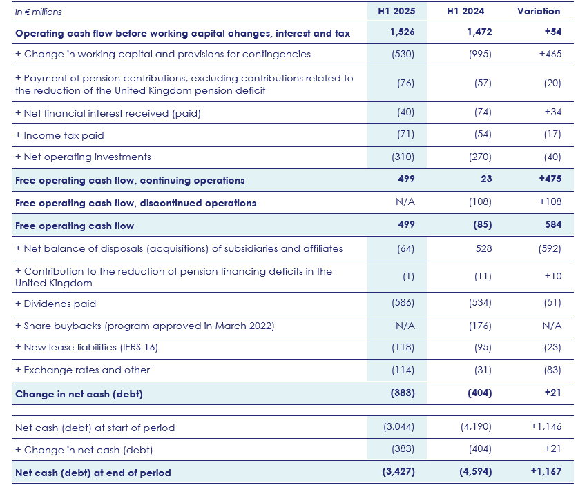 Free operating cash flow was positive at €499 million, compared to -€85 million in the first half of 2024. This strong increase was mainly driven by the improvement in the change in working capital requirements.