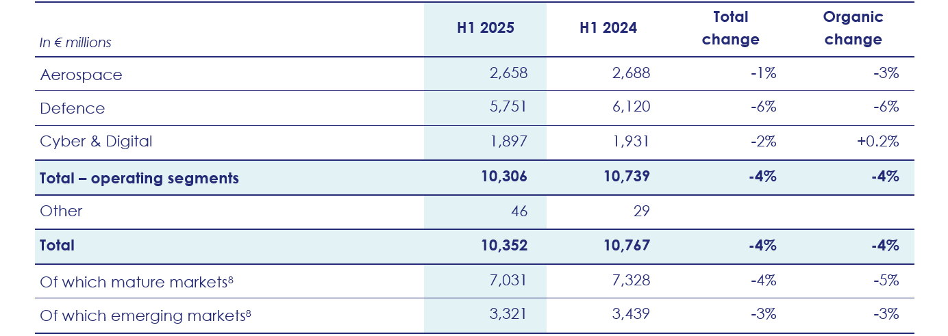 Geographically9, order intake in mature markets amounted to €7,031 million, down compared to the first half of 2024 (-4% in total change and -5% on an organic basis). This decline is mainly explained by a high comparison base in the first half of 2024, which included the contract related to the order of two F126 frigates by the German Navy.