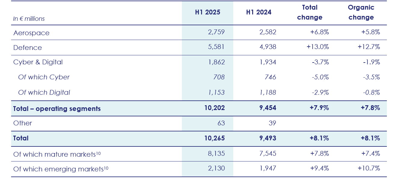 Sales in the Defence segment totaled €5,581 million, up 13.0% compared to the first half of 2024 (+12.7% at constant scope and exchange rates). After a very strong first quarter (+15.0% at constant scope and exchange rates), the segment continued to record double-digit growth in the majority of its activities in the second quarter.