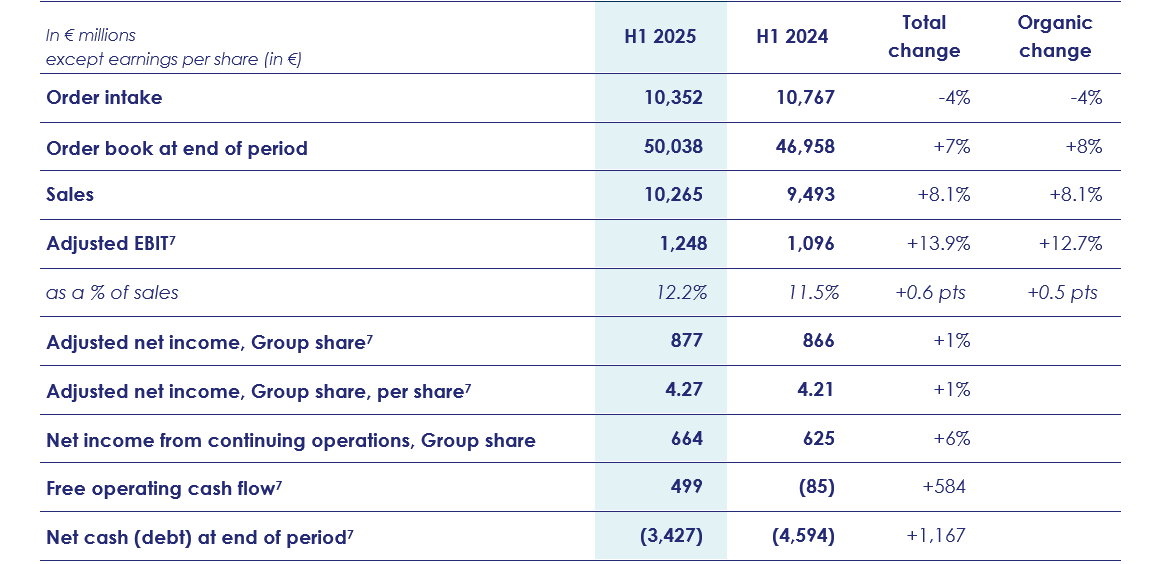 Order intake in the first half of 2025 amounted to €10,352 million, down -4% compared with the first half of 2024 (-4% also at constant scope and exchange rates). This slight decrease is explained by a high comparison basis, with the signing of three contracts with a unit value of more than €500 million in the first half of 2024 compared to only one in the first half of 2025. The sales momentum remains nonetheless very positive and the consolidated order book at June 30, 2025, totaled €50 billion, showing an increase of 7% compared to the first half of 2024. In this regard, the Group expects in the second half of this year the booking of the Air Defence contract signed with the United Kingdom for an amount of £1.16 billion, effective in July 2025.