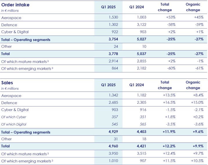 Geographically4, order intake in mature markets amounted to €2,914 million, similar to the first quarter of 2024 (+2% on a reported basis and a decrease of -1% at constant scope and exchange rates). Order intake in emerging markets amounted to €864 million (-61% as of March 31, 2025, in organic terms), affected by a very high comparison basis in these markets from the first quarter of 2024 (contracts for the Rafale in Indonesia and for an air surveillance system for a military customer in the Middle East mentioned previously).