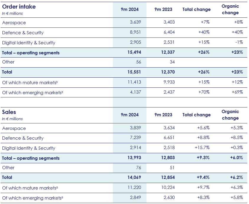 Order intake over the first nine months of 2024 amounted to €15,551 million, up 23% on an organic basis4 compared with the first nine months of 2023 (up 26% total change). The Group continued to benefit from an excellent commercial momentum in all its businesses, particularly in Defence & Security.