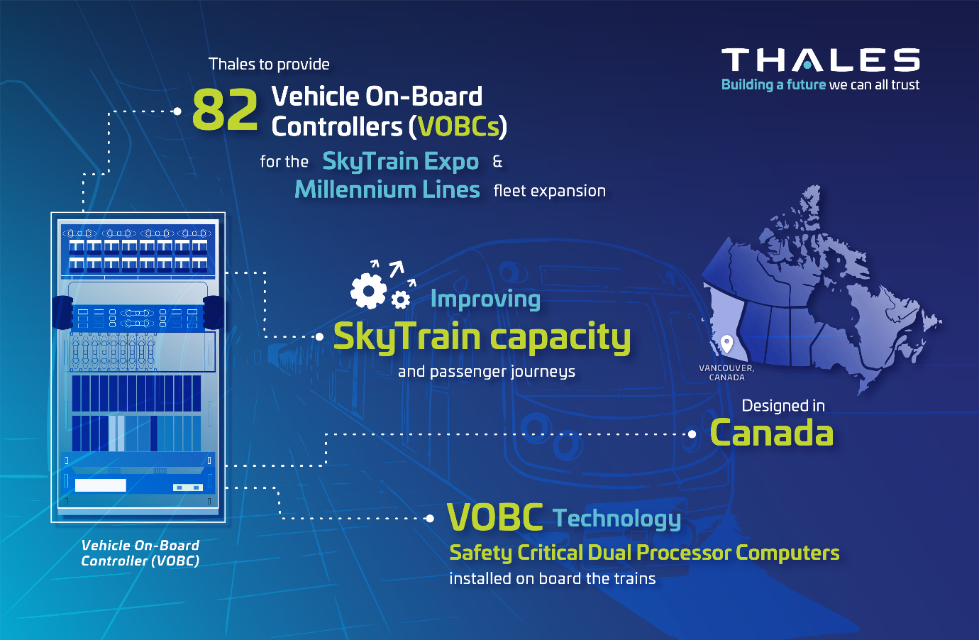 Thales will provide 82 innovative SelTrac™ Vehicle On-Board Controllers (VOBCs) on 41 new trains for the Vancouver, Canada, SkyTrain fleet expansion, which will operate on the Expo and Millennium Lines. The new technology will allow for increased capacity and reliability for passengers.