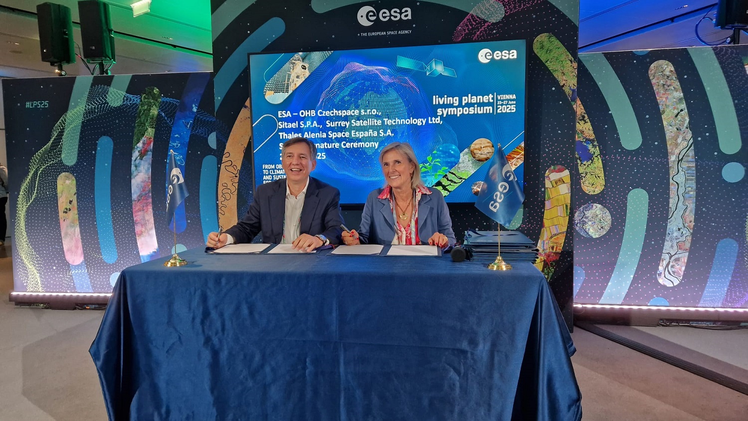 Signature Ceremony at the Living Planet Symposium in Vienna - Simonetta Cheli, ESA Director of Earth Observation Programmes and Ismael López, CEO of Thales Alenia Space in Spain © Thales Alenia Space