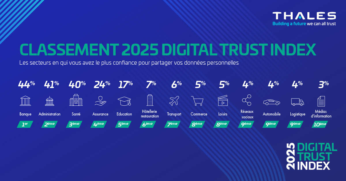 Thales révèle dans son 2025 Digital Trust Index - Consumer Edition le déclin à l’échelle mondiale de la confiance dans les services numériques par rapport à la même époque l’année dernière. Dans 13 secteurs différents, seuls l’assurance, la banque et le gouvernement ont vu leur niveau de confiance rester inchangé ou augmenter très légèrement. Lorsqu’il leur est demandé à quel secteur ils font le plus confiance pour leurs données personnelles, aucun secteur ne dépasse les 50 % d’approbation. Thales a interrogé plus de 14 000 consommateurs dans 14 pays sur leurs relations en ligne avec les marques et les services, leurs attentes en matière de protection de la vie privée et la manière dont les marques peuvent gagner leur confiance.
