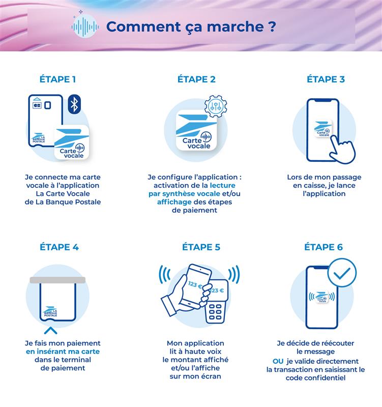 C’est dans ce cadre que La Banque Postale expérimente pendant 6 mois auprès de ses collaborateurs une carte bancaire à fonction vocale pour les personnes malvoyantes, non-voyantes, dyslexiques ou atteintes d’autres handicaps cognitifs, visant à simplifier et sécuriser leurs achats chez les commerçants. Conçue et fabriquée par Thales, la carte bancaire est munie d’un composant Bluetooth et d’une encoche ronde, permettant de l’identifier rapidement et de l’introduire correctement dans le terminal de paiement du commerçant. La « Carte Vocale » permet aux clients de réaliser leurs achats en magasin en entendant toutes les étapes de la transaction sur leur smartphone. La carte est associée à l’application mobile développée par la fintech HandSome, téléchargée sur le smartphone du client, qui permet de vocaliser ou d’afficher sur le smartphone, les informations présentes sur le TPE (Terminal de Paiement) lors du passage en caisse. Le client peut donc prendre connaissance et vérifier le montant des transactions avant de valider le paiement avec son code secret.