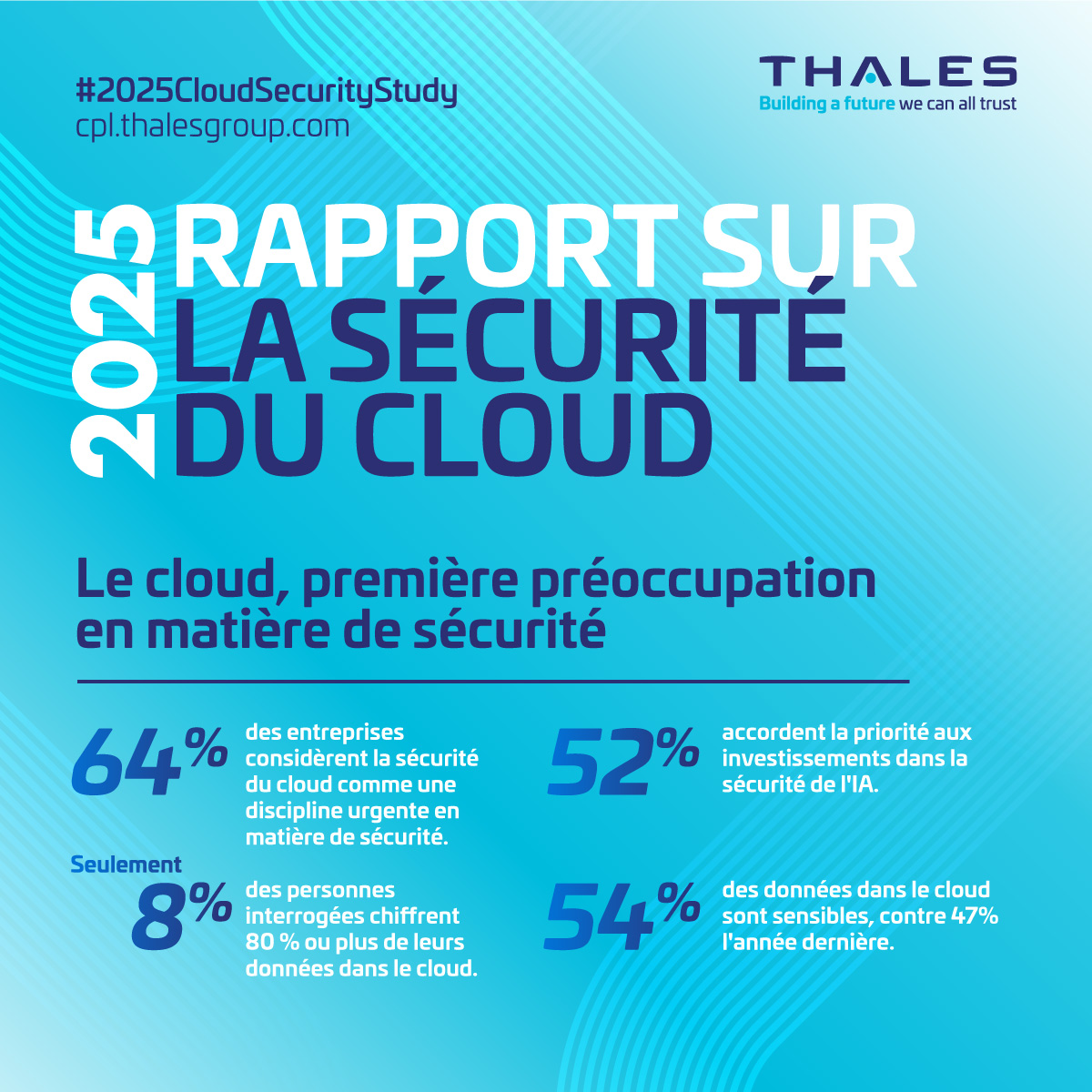 Le rapport 2025 de Thales « Cloud Security Study » confirme que la sécurité dans le cloud reste une préoccupation majeure pour les entreprises du monde entier. Près des deux tiers (64%) des répondants l'ont classée parmi leurs cinq principales priorités en matière de sécurité, 17% l'identifiant comme leur priorité numéro un. La sécurité pour l'IA, nouvelle priorité de dépenses cette année, s'est classée deuxième, soulignant son importance croissante. Malgré des investissements soutenus, la sécurité du cloud reste un défi complexe qui va au-delà de la technologie puisqu’elle implique les collaborateurs, les opérations et est directement liée à l'évolution des menaces.