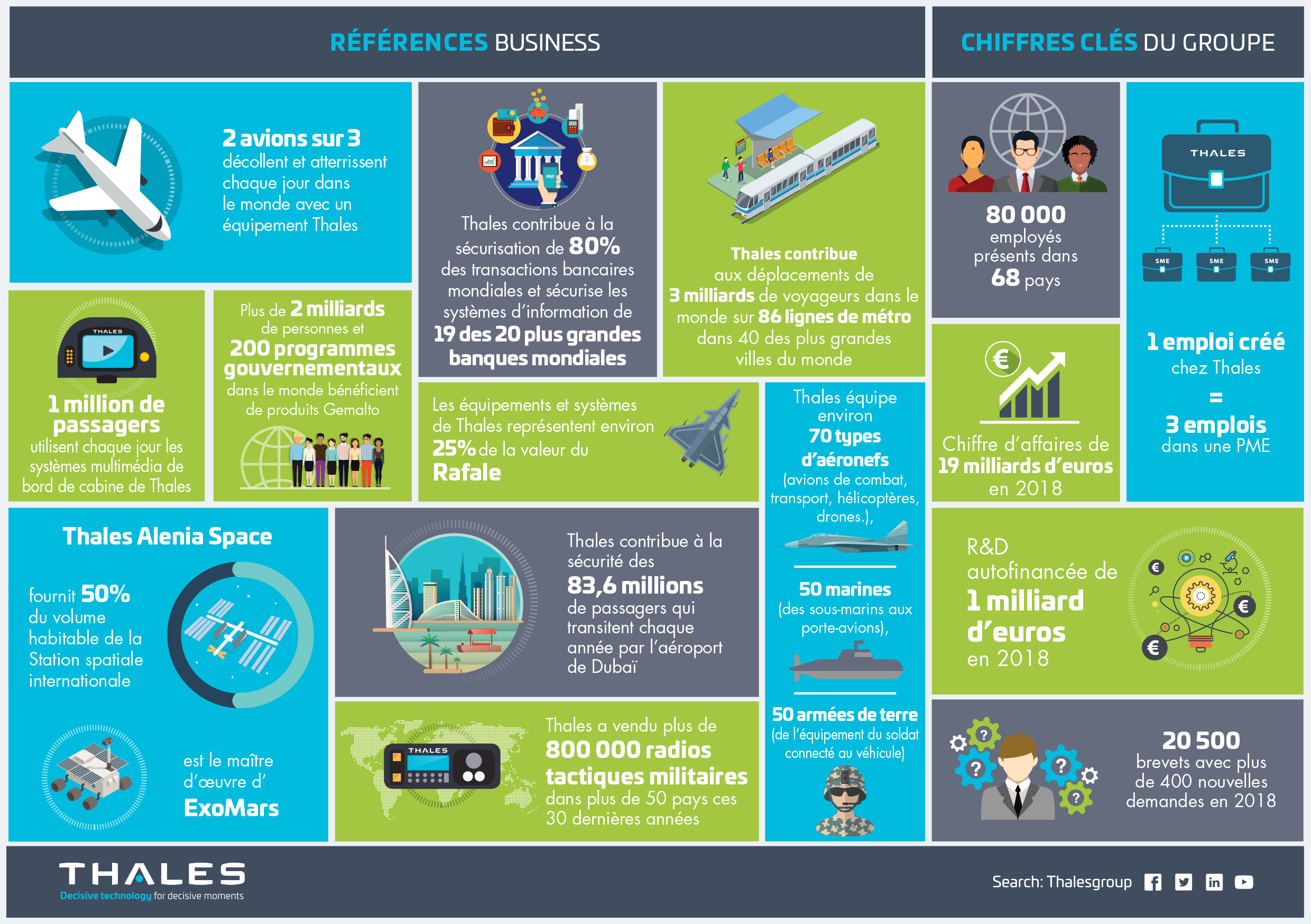 Fort de 80 000 collaborateurs dans 68 pays, Thales a réalisé en 2018 un chiffre d’affaires de 19 milliards d’euros.