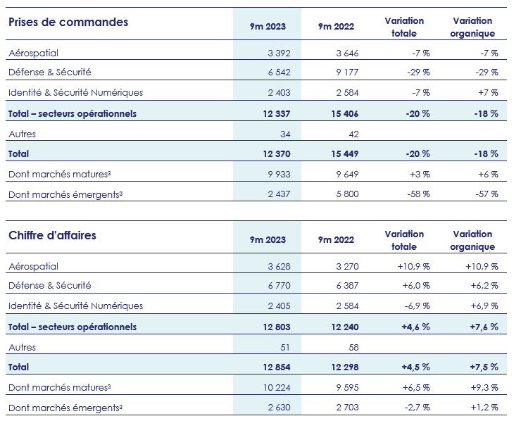 Le chiffre d’affaires affiche une hausse organique dans toutes les activités du Groupe sur les neuf premiers mois de l’année, malgré le ralentissement attendu du secteur Identité & Sécurité Numériques au troisième trimestre. La reprise de l’avionique civile se poursuit tandis que les perspectives de croissance du secteur de la Défense & Sécurité restent solides.