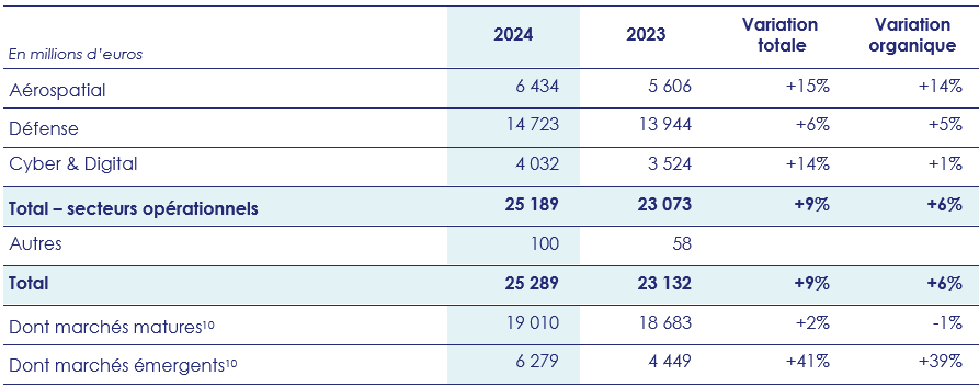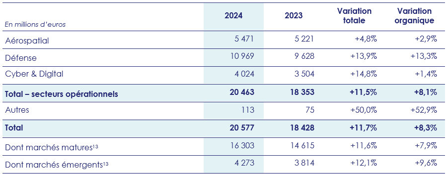 Le chiffre d'affaires de l’exercice 2024 s’établit à 20 577 M€, contre 18 428 M€ en 2023, en hausse de 11,7% en variation totale et de 8,3% à périmètre et taux de change constants14, tiré particulièrement par la solide performance du secteur Défense.
