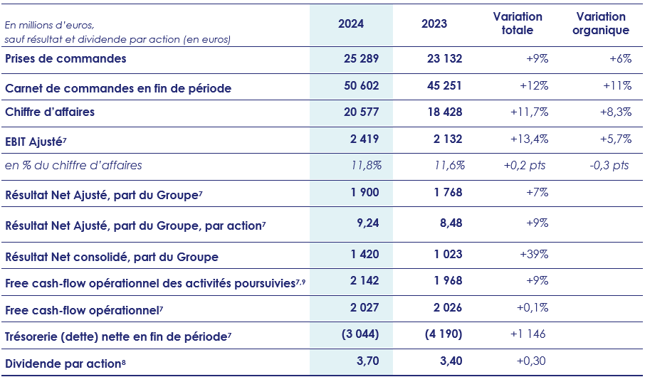 Le Groupe affiche pour 2024 un EBIT Ajusté16 de 2 419 M€, soit 11,8% du chiffre d’affaires, contre 2 132 M€ (11,6% du chiffre d'affaires) en 2023.