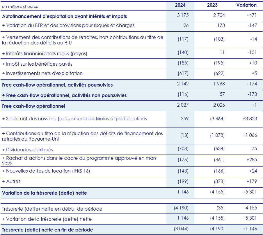 Le free cash-flow opérationnel des activités poursuivies7,9 s’élève à 2 142 M€, contre 1 968 M€ en 2023. En intégrant la contribution des activités non poursuivies, le free cash-flow opérationnel7 s’élève à 2 027 M€ contre 2 026 M€ en 2023.