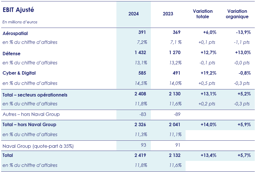 L'EBIT Ajusté du secteur Défense s’élève à 1 432 M€, contre 1 270 M€ en 2023 (soit une croissance de +13,0% à périmètre et change constants). La marge de ce secteur est stable à 13,1%, contre 13,2% en 2023.