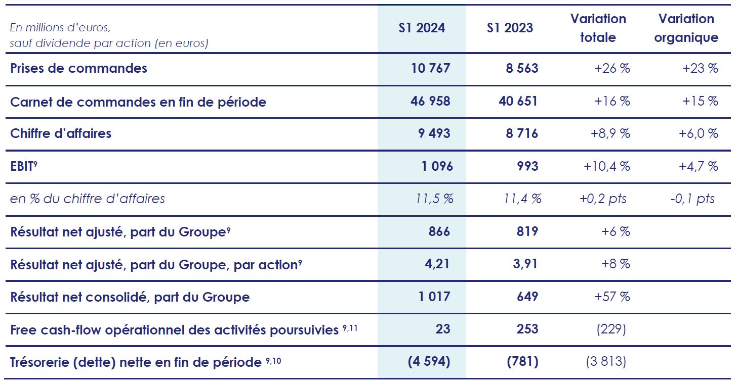 Les nouvelles commandes du premier semestre 2024 s’élèvent à 10 767 M€, en hausse de 26 % par rapport au premier semestre 2023 (+23 % à périmètre et taux de change constants13). Le ratio des prises de commandes rapportées au chiffre d’affaires (« book-to-bill ») s’élève à 1,13, en augmentation substantielle par rapport au premier semestre 2023 où il ressortait à 0,98.