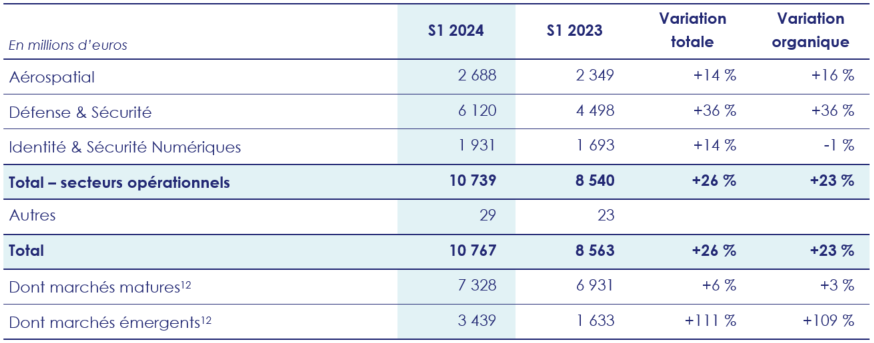 Le chiffre d’affaires du secteur Défense & Sécurité atteint 4 938 M€, en hausse de 8,7 % par rapport au premier semestre 2023 (+8,5 % à périmètre et change constants). Après un premier trimestre très soutenu (+13,4% à périmètre et taux de change constants), l’activité a enregistré, comme anticipé, une croissance plus modérée au deuxième trimestre (+4,5% à périmètre et taux de change constants). La croissance organique du chiffre d’affaires du secteur sur le semestre est en avance sur l'objectif annuel confirmé d’une croissance organique "mid-single digit plus” de l’activité.