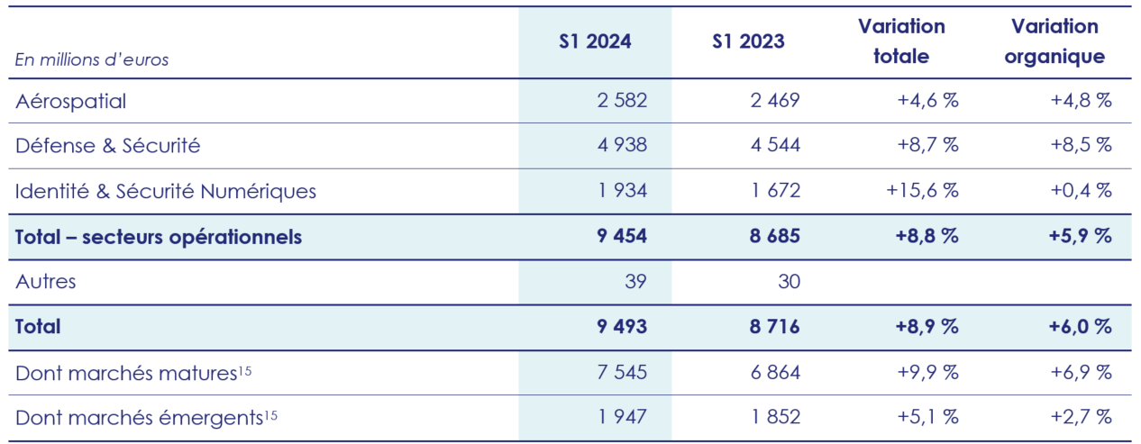 Le chiffre d’affaires s’établit à 9 493 M€, en hausse de 8,9 % par rapport au premier semestre 2023, et en hausse de 6,0 % à périmètre et taux de change constants. La progression du chiffre d’affaires bénéficie notamment d’une performance solide de l’Avionique et de la Défense & Sécurité.