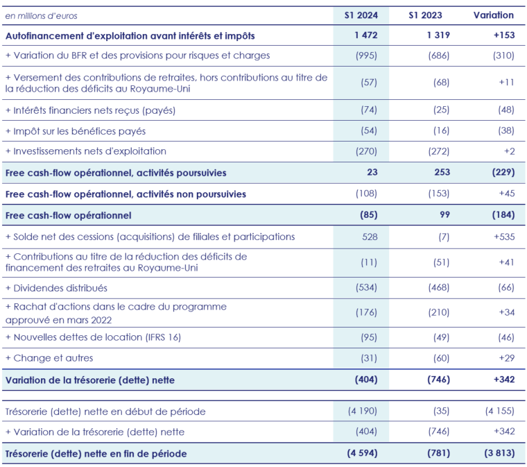 Le free cash-flow opérationnel des activités poursuivies11, excluant ainsi l’activité Transport cédée, est positif à hauteur de 23 M€ contre 253 M€ au premier semestre 2023. Comme annoncé, sur le premier semestre 2024 et par rapport au premier semestre 2023, le Groupe a enregistré un accroissement significatif de son besoin en fonds de roulement.
