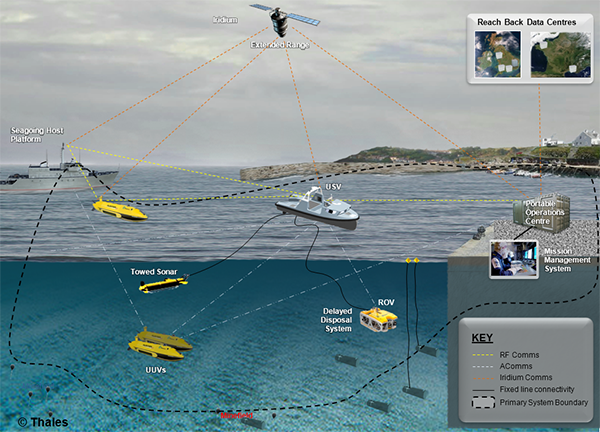 Dans le cadre du programme MMCM, Thales est engagé à fournir ces systèmes pour des évaluations opérationnelles par les marines française et britannique durant deux ans. Chaque système est constitué d’un drone de surface (USV Unmanned Surface Vehicle) équipé de moyens de navigation autonomes, de sonar de détection et d’évitement d’obstacles, de moyens d’identification et de neutralisation utilisant des véhicules téléguidés (ROV Remote Operated Vehicles), d’un sonar tracté (T-SAS Towed Synthetic Aperture Sonar), et de drones sous-marins autonomes (AUV – Autonomous Underwater Vehicles).