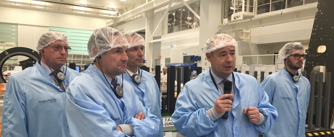 Dans les salles blanches de Thales Alenia Space Thierry Mandon pourra notamment découvrir des structures de la constellation de téléphonie mobile Iridium NEXT composée de 81 satellites interconnectés en orbite basse et dont le lancement du premier batch interviendra à l’été. A l’affiche également la maquette du produit de télécommunication de nouvelle génération Spacebus NEO, deux satellites de télécommunication pour la Corée et le satellite dual pour le Brésil SGDC en essai vide thermique.